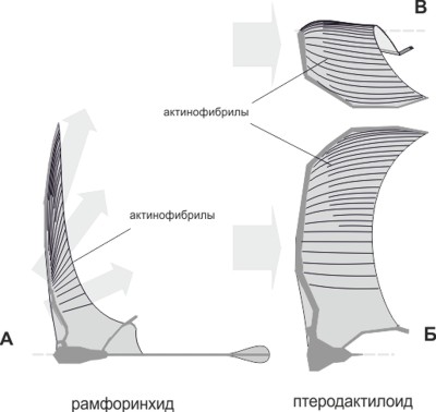 Экранопланная модель полёта снимает противоречия и в толковании расположения особых вставочных элементов мембраны крыла птерозавров – актинофибрилл, показывая согласованность их расположения с функциональной нагрузкой усиления мембраны крыла и направлением обтекающих крыло воздушных потоков (рис. 3). В том числе обосновывая это наличием двух эволюционных трендов среди птерозавров – так называемых базальных и продвинутых птерозавров, показывая специализацию первых на машущем полёте, а вторых – на экранолётном. Одновременно открыта возможность объяснить морфологические особенности таких своеобразных форм, как Anurognathus ammoni и Darwinopterus modularis среди базальных и Nemicolopterus crypticus среди продвинутых, обладающих признаками обеих групп. А с этим уточнить их положение на эволюционном древе птерозавров. В итоге выясняется, что те формы птерозавров, что, казалось бы, противоречат выдвинутой модели крыла, в действительности выступают её дополнительным подтверждением.