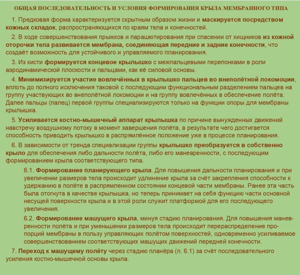 Опираясь на шаги становления птерозавров в статье показывается, что данный путь универсален. В частности, его проходили те млекопитающие, что обладают способностью к планированию или полноценному полёту – рукокрылые, летяги, шерстокрылы. Поэтому представлены принципиальные этапы формирования мембранного крыла как такового, и даны обоснования того, почему одни группы позвоночных достигли успеха, а другие остановились в эволюционном тупике (см. цветную таблицу).