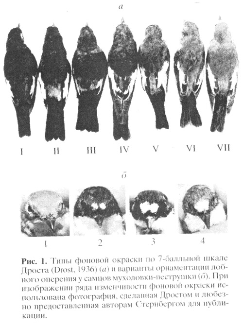 Е.В.Иванкина и ее коллеги ловили мухоловок-пеструшек с 1996 по 2005 г в лесах вокруг Звенигородской биостанции МГУ , где проживает одна из самых разнообразных по репертуару брачных нарядов популяция этих птиц (из семи классов окраски здесь отсутствует только первый – самый темноспинный). Ежегодно ловили от 105 до 194 самцов, а всего было осуществлено 1407 поимок 996 самцов (птиц кольцевали, и многих потом ловили повторно). Окраска каждого самца описывалась с большой детальностью; собранные данные были подвергнуты сложной статистической обработке. При этом учитывали репродуктивный статус самца («холостой» или «женатый»), а также его возраст («молодыми» считались годовалые самцы, все прочие – «старыми»).