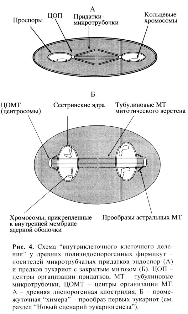Автор отмечает, что у некоторых фирмикут спорангий может образовывать не одну, а несколько (до 5-7) зрелых эндоспор. Возможно, образование множественных эндоспор – «полиэндоспорогенез» – был предшественником механизма деления ядра в ходе митоза у эукариот. То и другое – своего рода «деление клетки в клетке», причем «сегрегация хромосом, цитодифференциация, процессы внутриклеточного транспорта и их регуляция у спорулирующей бактериальной и митозирующей эукариотической клеток схожие».