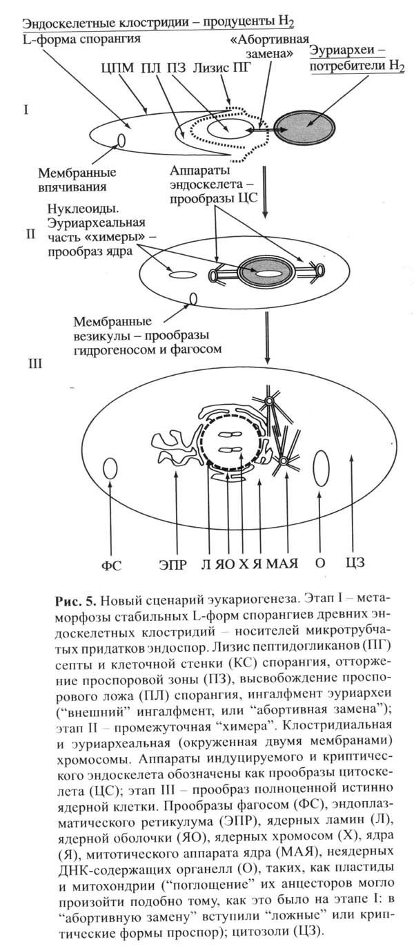 Получилась химера, содержащая две кольцевые хромосомы в разных компартментах клетки: архейная хромосома внутри будущего ядра (клетки археи), и хромосома клостридии в цитоплазме материнской клетки. В дальнейшем геном клостридии «перебрался» в ядро. Митотический аппарат сформировался на основе микротрубчатого цитоскелета спорангия, причем это могло произойти практически сразу, одномоментно, на основе имевшихся у эндоскелетеных клостридий механизмов деления спор внутри спорангия. Изначально протоядро химеры делилось по прокариотному типу: ядерная оболочка не разрушалась, хромосомы оставались прикрепленными к оболочке (нечто подобное наблюдается у современных жгутиковых водорослей-пирофитов).