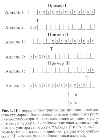 2) В предшественниках половых клеток одного из родителей (либо отца, либо матери) осуществляется импринтинг этих повторяющихся регуляторных участков. Чем больше таких участков будет «помечено», тем слабее работает ген-супрессор, и тем сильнее будет выражен у потомства тот признак, который этим геном-супрессором подавляется.