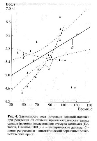 Второй пример – это график зависимости веса детенышей водяной полевки при рождении от степени привлекательности запаха самцов (которая определялась по времени исследования стимула самками) (рис. 4). Детеныши самцов, имевших более «интересный» для самки запах, весят в среднем больше. Это, конечно, проявление одного из механизмов выбора оптимального полового партнера (см.: Распутство матерей идет на пользу потомству , «Элементы», 9.11.06; Видообразование — личное дело каждого, «Элементы», 15.02.06). А. И. Кутмин заметил в графике некую крестообразность (по правде сказать, довольно слабо выраженную) и предположил, что, возможно, вес новорожденных регулируется предложенным им эпигенетическим механизмом. Только для этого надо еще сделать дополнительное допущение, что степень привлекательности запаха самца определяется его «эпигенетическим возрастом» – а это очень и очень смелое допущение. Ведь известен уже ряд факторов, определяющих привлекательность запаха самца для самок грызунов: это и состояние его здоровья, и уровень половых гормонов, и степень родства с самкой. Добавить сюда еще и «эпигенетический возраст» чисто теоретически, конечно, можно, но едва ли это стоит делать без веских оснований, только потому, что так лучше для предлагаемой автором гипотезы.