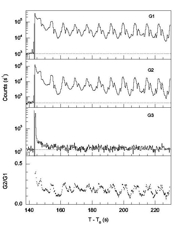 Всплеск 27 декабря 2004 г. по данным прибора Конус на спутнике Wind. Из работы Е. П. Мазеца и др. astro-ph/0502541. G1 и G2 соответствует двум спектральным диапазонам