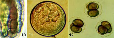Только через двое суток питания другими микроводорослями — динофлагеллятами — самки Calanus helgolandicus отложили отдельные, прозрачные, правильно делящиеся яйца с нормально сформированной оболочкой (еще через сутки они дадут жизнь науплиям, но часть из них все же будет иметь дефекты). Характеристики оболочки яиц Calanus brevicornis восстанавились не полностью: цитоплазма эмбрионов окрашена равномерно в коричневый цвет, свойственный диатомеям, а адгезивные свойства мембран всё еще нарушены. Эмбрионы погибали, достигнув стадии восьми клеток (фото 12). Чтобы калянусы произвели на свет нормальное потомство, им потребовалось еще несколько суток питания динофлагеллятами.