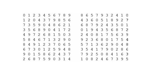 Однако главным результатом соревнования стало нахождение двух пар диагональных ортогональных латинских квадратов порядка 10. Ниже приведена одна из найденных пар.
