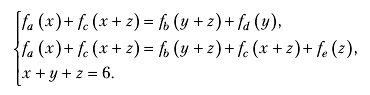 3) x + y = 6,  x > 0,  y > 0,  fa(x) + fc(x) = fb(y) + fd(y).
