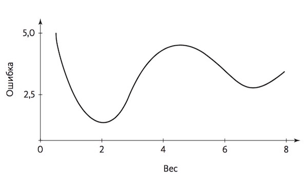 Так как же обратное распространение решает проблему машинного обучения? Может быть, надо просто собрать кучу нейронов, подождать, пока они наколдуют все, что надо, а потом по дороге в банк заехать получить Нобелевскую премию за открытие принципа работы мозга? К сожалению, в жизни все не так просто. Представьте, что у вашей сети только один вес; зависимость ошибки от него показана на этом графике: