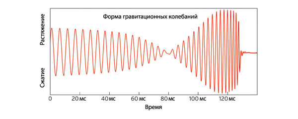 Рис. 16.2. Последние 120 миллисекунд (мс) гравитационных колебаний, зарегистрированных в ЛИГО (График, построенный мной на основе моделирования Янбея Чена, Фукара и других (2011).)
