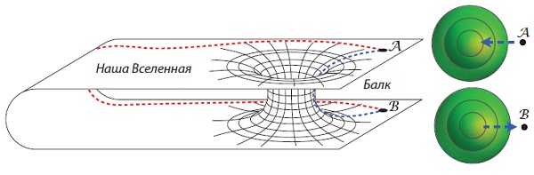 Поскольку одно из измерений нашей Вселенной на этом рисунке отсутствует, вам следует думать о себе как о двумерном существе, перемещения которого ограничены поверхностью изогнутого «листа» или двумерных стенок червоточины. Есть два способа попасть из пункта A нашей Вселенной в пункт B: короткий путь (синий пунктир) по стенке червоточины и длинный путь (красный пунктир) по поверхности «листа» нашей Вселенной.