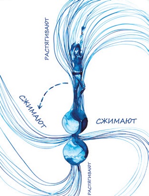 На рис. 16.6 — художественное изображение тендекс-линий двух черных дыр, которые вращаются по орбитам друг вокруг друга, против часовой стрелки, и затем сталкиваются. Напоминаю, что тендекс-линии порождают приливную гравитацию (см. главу 4). Линии, которые исходят из двух наиболее удаленных друг от друга точек на поверхностях пары черных дыр, растягивают все на своем пути, включая попавшую на рисунок подругу художницы. Линии же, исходящие из области столкновения, все сжимают. Когда дыры вращаются одна вокруг другой, они увлекают следом свои тендекс-линии, которые походят на струи воды из крутящейся поливалки на газоне.