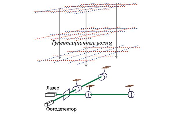 Рис. 16.8. Гравитационные волны, проходящие через детектор ЛИГО