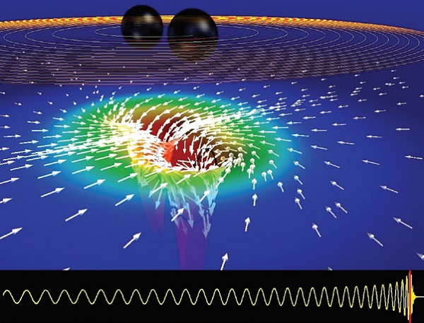 Однажды, в 2019 году, в ЛИГО зарегистрировали самый сильный всплеск гравитационных волн за всю историю проекта (рис. 16.2). Волны колебались с амплитудой, которая несколько раз нарастала и спадала, а затем внезапно затихли. Этот всплеск длился лишь несколько секунд.