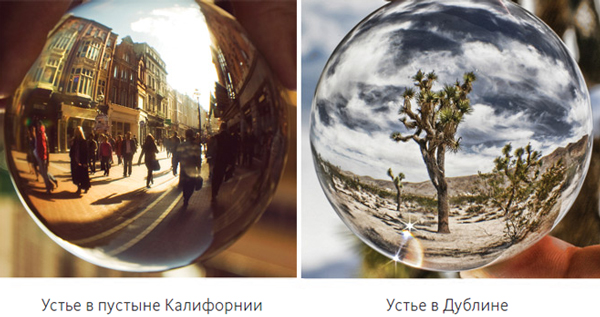 Вход в червоточину называется устьем. И вот вы сидите в придорожном кафе неподалеку от дублинского устья, а я стою напротив устья в калифорнийской пустыне. Оба устья напоминают хрустальные шары: глядя в калифорнийское устье, я вижу искаженное изображение Графтон-стрит (рис. 14.6). Это изображение сформировано лучами света, прошедшими через червоточину из Дублина в Калифорнию, подобно тому как свет передается по оптоволокну. А вы, посмотрев в дублинское устье, увидите искаженное изображение зарослей гигантской юкки в калифорнийской пустыне.