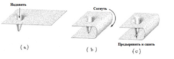 Один из способов создать червоточину — это извлечь ее из квантовой пены (если эта пена существует), увеличить до человеческих масштабов или больше и ввести в нее экзотическую материю, которая будет удерживать червоточину открытой. Сложновато даже для сверхразвитой цивилизации, хотя, возможно, нам так кажется лишь потому, что мы не знаем законов квантовой гравитации, управляющих пеной, извлечением червоточины и ее увеличением (см. главу 26). И, конечно, ясного представления об экзотической материи у нас тоже нет. На первый взгляд, создать червоточину несложно (рис. 14.8). Просто берешь и продавливаешь часть нашей браны (Вселенной) вниз в балк и получаешь вмятину, потом загибаешь брану в балке, протыкаешь в ней, точно под вмятиной, дырку, протыкаешь другую дырку на дне вмятины и наконец сшиваешь края дырок. Делов-то!