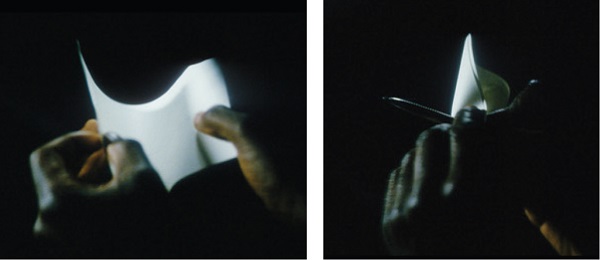 Рис. 14.9. Ромилли рассказывает о червоточинах. Слева: он сгибает лист бумаги. Справа: втыкает карандаш (червоточину) в лист, соединяя две дырки (Кадры из «Интерстеллар», с разрешения «Уорнер Бразерс».)