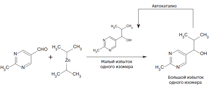Распознавание изомеров друг другом может происходить не только при образовании кристаллов. В 1996 году коллективом японских химиков была открыта реакция, названная по имени руководителя группы — реакция Соаи (Blackmond, 2010). В ней из двух оптически неактивных веществ (пиримидиновый альдегид и цинкоорганическое соединение) образуется оптически активный пиримидиновый спирт, причем соотношение изомеров далеко от 1:1 и случайно меняется от опыта к опыту (рис. 8.5). Загадочные свойства этой реакции десять лет не удавалось объяснить, но теперь мы знаем, что тут действует три фактора: