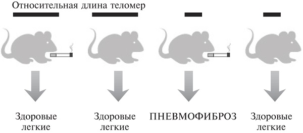 Ученые экспериментально исследовали влияние сигаретного дыма на организм. Они вырастили генетически модифицированных мышей с укороченными теломерами и затем подвергли самых разных мышей воздействию сигаретного дыма32. Результаты показаны на