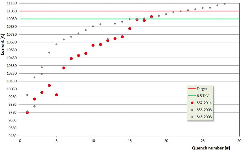 Тренировка магнита — это аккуратное прохождение нескольких циклов повышения тока вплоть до срыва сверхпроводимости. Опыт показывает, что после каждого срыва магнит слегка «исправляется» и на следующем цикле он может держать чуть больший ток, чем до этого. Микроскопический механизм этого процесса исследован не до конца, но, в общих словах, во время каждого цикла материал внутри магнита чуть смещается, зоны напряжения рассасываются, что и оптимизирует магнитное поле. Типичный пример эволюции магнитов показан на рис. 3 на примере сектора 6–7. За 20 циклов нагрузки и срыва максимальный ток поднялся примерно на 10% и достиг цели 11 кА, отвечающей пучкам 6,5 ТэВ.