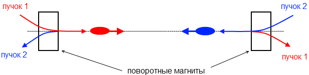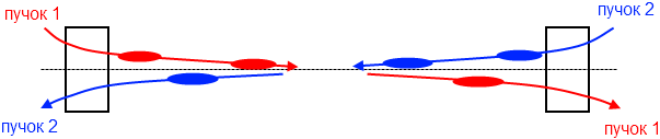 Если в пучке имеется лишь 50 сгустков, они следуют друг за другом на расстоянии несколько сот метров. Это значит, что пока один сгусток летит по общей трубе и сталкивается со встречным сгустком, никакие другие сгустки ему не мешают: все они находятся далеко. Если же количество сгустков увеличить до нескольких сотен, то сгустки начнут мешать друг другу. Пока сгусток летит в общей трубе, ему успеют по пути встретиться сразу несколько сгустков из встречного пучка. Только одно из этих пересечений по-настоящему важно — то, которое происходит в центре детектора, там, где сгустки максимально сфокусированы. Все остальные пересечения считаются «паразитными», они лишь дестабилизируют пучки, и поэтому от них надо избавиться.