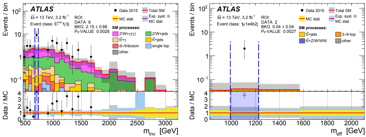 Рис. 1. Два примера отклонений со статической значимостью 3σ, обнаруженные автоматизированным поиском; соответствующие области выделены синим цветом. Слева: процесс рождения фотона и трех струй с дисбалансом поперечного импульса; в сигнальной области обнаружено девять событий при ожидаемом значении 2,15±0,66. Справа: процесс рождения мюона, электрона, четырех b-струй и двух обычных струй; в сигнальной области найдено два события при ожидаемом значении 0,04±0.04. Изображение из статьи: ATLAS Collaboration. A strategy for a general search for new phenomena using data-derived signal regions and its application within the ATLAS (arXiv:1807.07447)