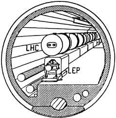 В течение пяти лет в ЦЕРНе ведутся экскавационные работы по прокладе кольцевого 27-километрового туннеля. В нём будет расположен Большой электрон-позитронный коллайдер (LEP), а по окончании его работы, в 2000-е годы, в том же туннеле будет смонтирован и Большой адронный коллайдер (LHC). Прокладка туннеля стала крупнейшим на то время экскавационным проектом в Европе (рекорд был побит в 1988 году, когда начались работы по прокладке подземного туннеля под Ламаншем.) Стоимость этих работ составила более половины всего бюджета LEP. Подробнее про раннюю историю LEP см. в лекции Стива Майера (1990 год). |