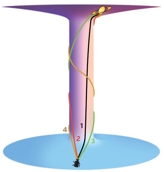 Чтобы понять, почему это происходит, можно нарисовать траектории лучей света возле червоточины (вид из балка): рис. 15.3. первичное изображение приходит в камеру пучком световых лучей, идущих от Сатурна по кратчайшему из возможных путей; один из лучей этого пучка изображен на рисунке черной линией (1). Вторичное изображение достигает камеры с пучком, в который входит красный луч (2); этот пучок проходит вдоль стенки червоточины в направлении, противоположном направлению черного луча, закручиваясь влево, против часовой стрелки — по кратчайшему из возможных левовращающихся путей от Сатурна до камеры. Третичное изображение приходит с пучком зеленого луча (3), по кратчайшему из возможных правовращающихся путей, делающих больше одного оборота вдоль стенки червоточины. и, наконец, изображение четвертого порядка приходит с пучком коричневого луча (4), по кратчайшему из возможных левовращающихся путей, делающих более одного оборота вдоль стенки червоточины.