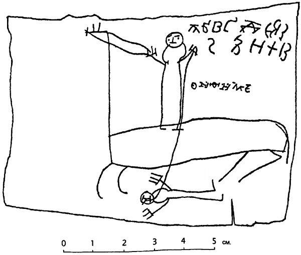 Грамота № 200 почти целиком заполнена рисунком маленького художника, уже знакомого нам своей «творческой манерой». Маленький художник мечтал о доблести и о подвигах. Он изобразил некое подобие лошади и всадника на ней, который копьем поражает брошенного под копыта лошади врага. Около фигуры всадника помещена пояснительная надпись: «Онфиме». Мальчик Онфим нарисовал свой «героизированный автопортрет». Таким он будет, когда вырастет, — мужественным победителем врагов Новгорода, смелым всадником, лучше всех владеющим копьем. Что же, Онфим родился в героический век новгородской истории, в век Ледового побоища и Раковорской битвы, в эпоху великих побед новгородцев. И на его долю наверняка с лихвой досталось схваток и подвигов, свиста стрел и стука мечей. Но, помечтав о будущем, он вспомнил настоящее и на свободном клочке бересты рядом с «автопортретом» написал: «АБВГДЕЖSЗИIК».