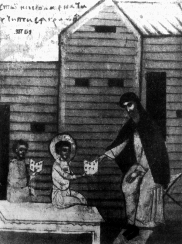 Фигура новгородца, к поясу которого привешено неразлучное с ним орудие письма на бересте, стала известной в результате раскопок, но её смутное отражение на стенах новгородских церквей историки наблюдали и раньше, не различая, правда, важной для нас детали.