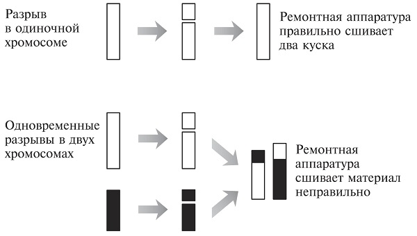 Рис. 5.1. Вверху: одиночная хромосома претерпевает разрыв. Клеточная аппаратура чинит ее. Внизу: две хромосомы разрываются одновременно. Клеточная аппаратура может не суметь разобраться, какой хромосоме принадлежат куски. Хромосомы могут оказаться сшитыми неправильно. Так возникают гибридные хромосомные структуры.