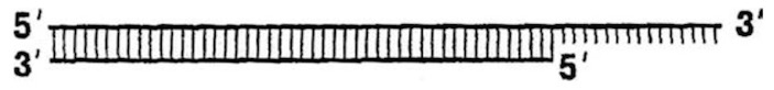 Так вот, цепи ДНК (и РНК) могут удлиняться только с 3’-конца, точнее с 3’-концевой гидроксильной группы OH. Удлинение производится при помощи специальных ферментов: ДНК- и РНК- полимераз. Ну это для читателя не новость, об этих ферментах уже много говорилось выше. Напомним, что, чтобы вести синтез, полимеразам необходимы четыре предшественника нуклеотидов и матрица (цепь ДНК или РНК), чтобы полимераза знала, какой нуклеотид ставить следующим. Эволюция привнесла еще одно существенное ограничение или, если хотите, ляп. ДНК-полимераза не способна начать синтез ДНК, имея только матрицу: ей еще подавай затравку (называемую праймером) с 3’-концевой OH-группой, иначе она работать категорически отказывается. Это свойство всех ДНК-полимераз (и ревертаз). РНК-полимеразы не столь привередливы, им достаточно матрицы, чтобы начать синтез. Кстати, ДНК-полимеразе безразлична химическая природа праймера (ДНК или РНК), лишь бы была 3’-концевая OH-группа. Одиночная цепь ДНК с сидящим на ней праймером выглядит так: