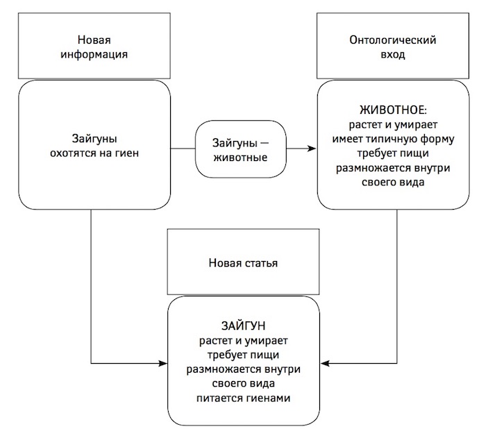 Новая информация (левая рамка) вызывает в сознании старые данные (правая рамка), в результате энциклопедия пополняется (нижняя рамка). Так обрабатываются не только понятия, относящиеся к животному миру. Например, см. схему ниже.