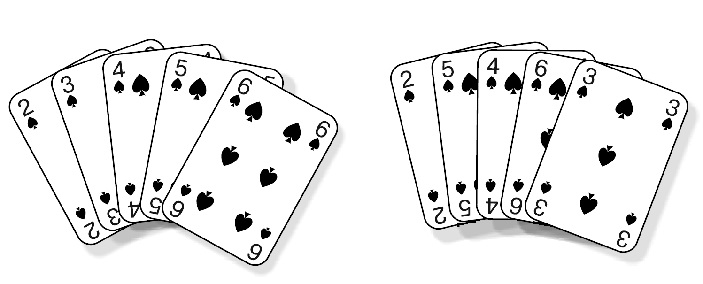 Рис. 4.3. Энтропия как мера неупорядоченности. Последовательность из пяти карт слева имеет меньшую энтропию, нежели последовательность карт, изображенная справа
