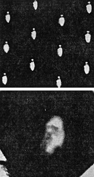 Но главная загадка в том, как подобная оптика может продуцировать неперевернутое изображение. И именно Экснер (работавший над этой задачкой в восьмидесятые годы ХIX века, без инструментов для окончательного доказательства) догадался, что рабдом суперпозиционного глаза функционирует как двухлинзовый телескоп, перенаправляющий лучи света таким образом, что внутри цилиндра они перекрещиваются и переворачивают изображение. «Очевидно, — отмечает биолог Майкл Ленд, — мы имеем здесь дело с чем-то весьма неординарным»23. Приведенные ниже виды, отснятые Лендом и Дэн-Эриком Нильсоном, демонстрируют разницу между изображениями, продуцируемыми двумя типами составного глаза. Перевернутый аппозиционный вид сверху сфотографирован через роговицу ктыря; довольно расплывчатый портрет (Чарльза Дарвина) виден через глаз светляка24.