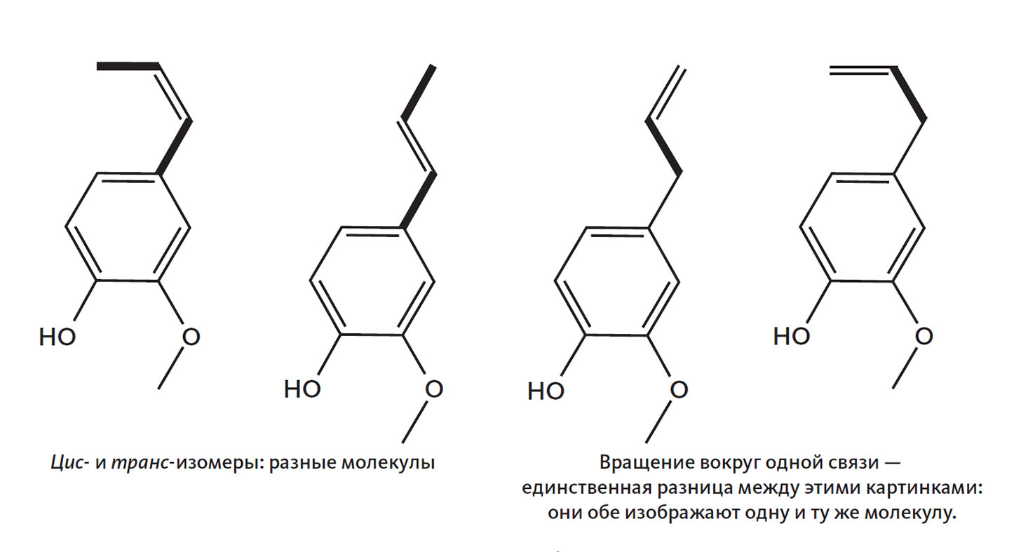 Изоэвгенол — как раз такая молекула с полным названием транс-2-метокси-4-(проп-1-ен-1)фенол, и у него есть родной брат (или, если угодно, сестра), который называется цис-2-метокси-4-(проп-1-ен-1)фенол. В менее формальной версии они известны нам как цис- и транс-изомеры; у транс-изомеров одинарные связи находятся с противоположных сторон от двойной связи, а у цис-изомеров они находятся с одной стороны, как видно по жирной линии вверху слева на рисунке 14.