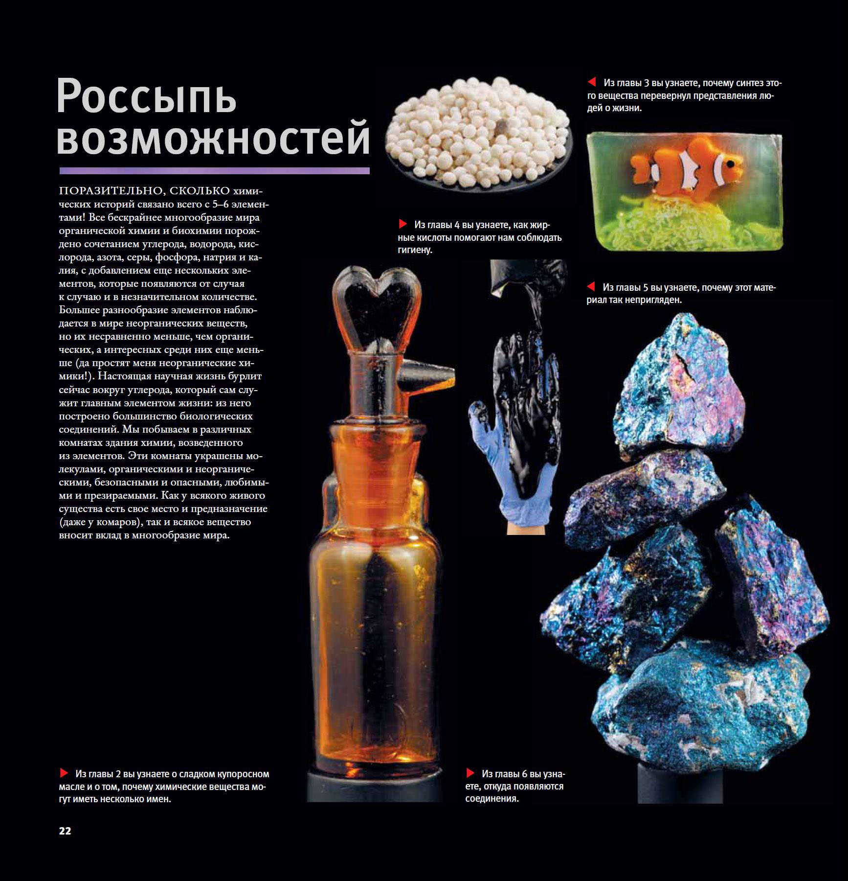 Поэтому «Молекулы» — этакое яркое до сногсшибательности поппури из относительно систематизированных разделов химии. Структура химической связи, химическая номенклатура, органика и неорганика, полимерная химия, нейромедиаторы, агонисты и антагонисты рецепторов нервной системы, химия пахучих веществ сменяют друг друга, как в калейдоскопе. И все с потрясающими картинками, емкими теоретическими вставками и захватывающими байками из жизни молекул. Это увлекает и затягивает, но серьезной теоретической базы не дает: после прочтения книги у вас в голове останется множество обрывочных, но интересных фактов: что асбест химически инертен и может годами оставаться в легких, повреждая ДНК клеток и приводя к раку; что гуттаперчей иногда заполняют каналы зубов после удаления нерва; что огненные муравьи мало того, что вырабатывают ядовитый соленопсин, так еще и едят все подряд, начиная от зданий и заканчивая металлическими проводами.
