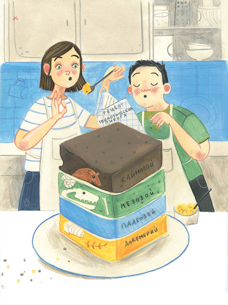 Нужно сразу же сказать о дизайне и верстке книги, выполненных, точно тетрадь Маши, с очаровательно детскими, но информативными и по-научному точными рисунками. Иллюстрации Елены Смешливой не только увлекают и притягивают взгляд, но и являются вспомогательным инструментом для визуализации некоторых достаточно сложных концептов. Так, вкупе с простыми и меткими метафорами, становится намного проще понять появление геологических слоев (рис. 2), хронологию формирования окаменелых останков динозавров и первых людей (рис. 3), и то, как выглядят 2020 лет в масштабе миллиона лет (рис. 4).