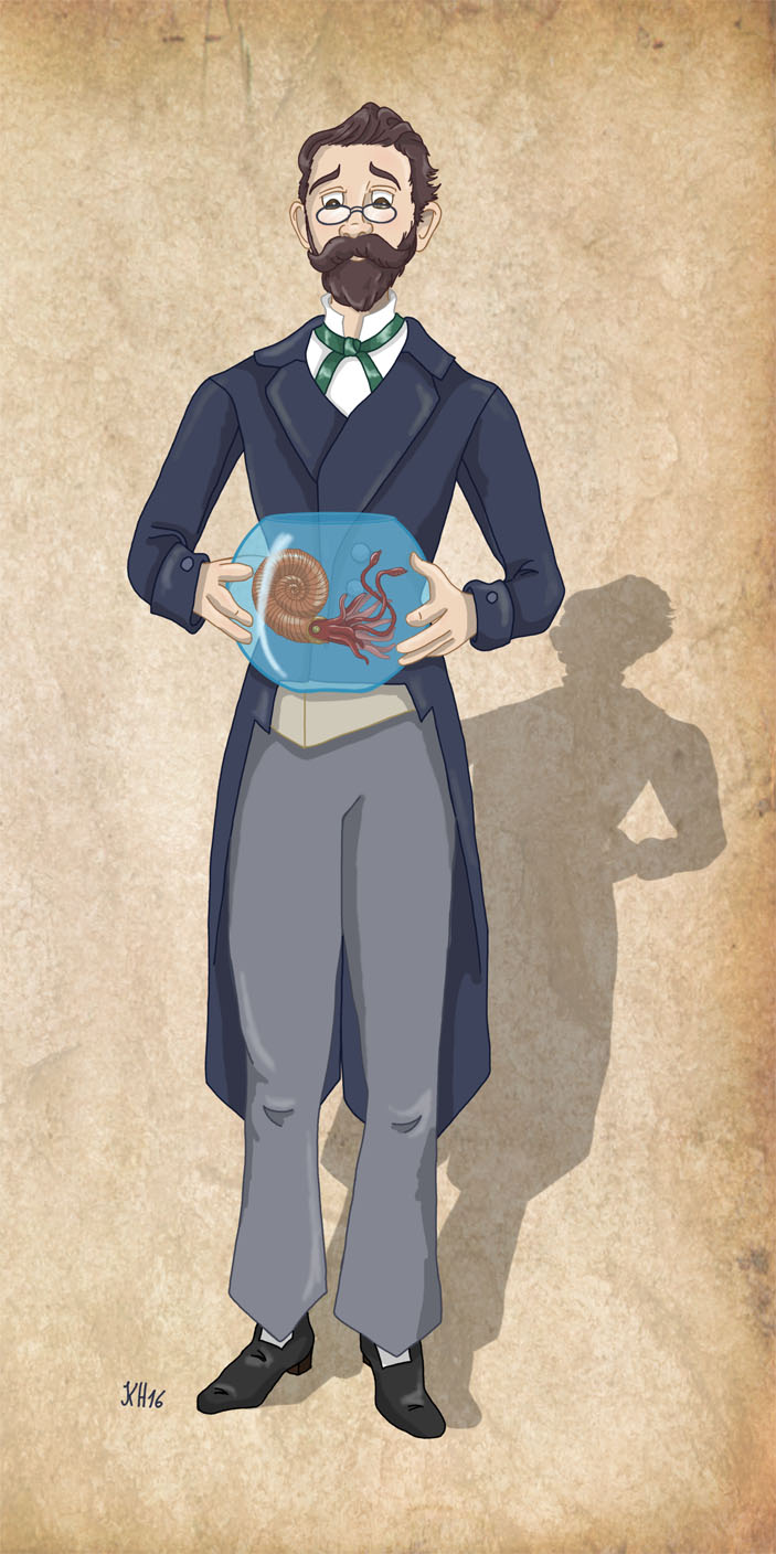 Карл Альфред Циттель, знаменитый палеонтолог второй половины XIX века, держит в руках аквариум с аммонитом. Именно Циттель выделил эту вымершую группу моллюсков и дал ей название. Не все рисунки Катарины Хольцингер, изображающие «палеонтологов с их питомцами», вошли в книгу; это — один из тех, которые по каким-то причинам не вошли. Изображение с сайта deviantart.com