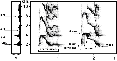 По оси абсцисс на рисунке отложено время, по оси ординат - частота. Звуковые колебания определенной частоты на спектрограмме представлены в виде темных полос. Параметры, описывающие звук, можно подразделить на: 1) временные - длительность звука и интервалы между звуками; 2) частотные - основная частота звука (f0), соответствующая у млекопитающих частоте колебания голосовых связок и изменяющаяся при различном натяжении связок и скорости проходящего через них потока воздуха из легких; 3) энергетические - доминантную частоту звука (f дом), на которой сосредоточен максимум энергии звука, выражающейся в величине амплитуды звуковых колебаний.