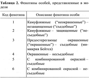 Всего в модели возможны шесть фенотипов особей (табл.2). При этом в любой момент времени распределение особей по фенотипам может быть каким угодно, но общая численность особей всегда равна 1000.