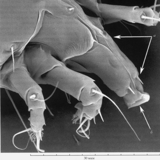 Итак, возможностей что-то изменить «к лучшему» в своей эволюционной судьбе у этих организмов не так уж и много. Тем не менее имеются два важных параметра, вариация которых вызывает согласованные изменения морфологии и экологии четырехногих клещей: изменение типа питания и освоение субниш. Дело в том, что клещи этой группы могут обитать либо на поверхности листовой пластинки, либо внутри ткани листа или спровоцированного ими галла. Ротовой аппарат эриофиоидей образован телескопически складывающимися пальпами с терминальной присоской (рис. 1.) и приспособлен к питанию соками эпидермальных (поверхностных) клеток растения. Однако существуют клещи, которые приспособились проникать глубже в паренхимный (более глубокий) слой клеток. Такие приспособления, по всей видимости, сформировались во многих случаях независимо друг от друга. Например, один из эволюционных сценариев реализовался у клещей относительно молодого семейства Diplomiopidae и связан со сменой растения-хозяина, другой случай мы наблюдаем у представителей наиболее древнего семейства Phytoptidae. Дипломиопиды имеют мощный и удлиненный (в 2-4 раза по сравнению с другими эриофиоидеями) ротовой аппарат. Толчком для формирования такого аппарата была смена однодольного растения-хозяина с мягким эпидермисом на двудольное растение, у которого плотность клеточной стенки эпидермиса значительно выше. Совсем иного происхождения случай формирования мощного ротового аппарата у фитоптиид объясняется обитанием на хвойных голосеменных растениях с их жесткими покровами листьев. Семейство Phytoptidae наиболее древняя группа эриофиоидей и, скорее всего, изначально сформировалось именно на этих растениях. Анализ показывает, что изменчивость четырехногих клещей сопряжена с эволюцией растений, на которых они питаются. Изначально в эволюционном плане это были паразиты голосеменных, затем произошла дивергенция клещей, ассоциированная с делением покрытосеменных растений на однодольные и двудольные растения, с последующим переходом наиболее молодых семейств на эволюционно новые группы растений. А на примере клещей из сем. Eriophyidae мы наблюдаем и вторичный переход с покрытосеменных растений на голосеменные.