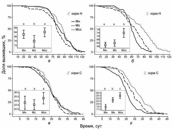 Во-первых, это проявилось в различиях по продолжительности жизни мух. К примеру, согласно рис. 1. мухи Мсс живут на кормах Н и С по крайней мере не меньше, а в большинстве случаев достоверно дольше, чем мухи, культивируемые в гомогенных условиях на благоприятном корме Н или стрессовом корме С без возможности выбора.