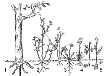 Имеется два подхода к экологической классификации видов растений, по аналогии с классификацией сообществ: физиогномический и флористический. Физиогномические экологические классификации основаны на выделение групп видов по сходству внешнего облика растений, флористические – по сходству требований к экологическим условиям. В первом случае принято различать жизненные формы растений (ЖФ) и формы роста (ФР). Считается, что ЖФ, т.е. собственно морфология растения, является следствием адаптации растения к условиям среды, тогда как ФР определяется «внутренним механизмом» и относительно независима от комплекса внешних условий. Надо отметить, что в отечественных исследованиях понятие ФР непопулярно, зато применение нашли несколько систем ЖФ. Фундамент деления растений по ЖФ заложил философ Теофраст за 300 лет до н.э. Он выделил три типа ЖФ – деревья, кустарники и травы. Эти три типа до сих пор применяются в качестве упрощенной схемы для разного рода обобщающих исследований (см., например, статью в текущем номере ЖОБ «Современная и мел-кайнозойская диверсификация покрытосеменных»). Однако эта система получила развитие в работах ботаников, которое пошло по пути увеличения числа типов и подтипов ЖФ. Так, например, в системе Гумбольдта (1806) насчитывается 16 типов форм, среди которых пальмы, кактусы, банан, а в системе Друде (1896) число подтипов достигло 60, объединенных в 7 основных типов: древесные растения, суккуленты, лианы, эпифиты, злаки, лишайники, мхи. Одной из наиболее широко известных и применяемых физиогномических классификаций является система К. Раункиера. Он предложил систему основанную всего на одном признаке – положении и способе защиты почек возобновления в течение неблагоприятного периода (холодного или сухого) (рис. 1).