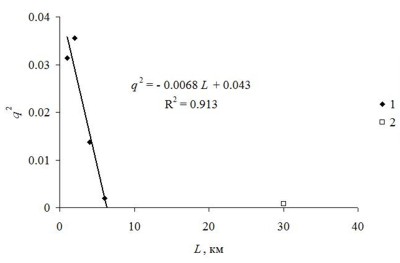 В качестве объекта исследований выбраны лесные насаждения на различных расстояниях от источников поллютантов (медеплавильных заводов на Кольском полуострове, Таймыре, Урале). При этом рассматривались как длительные, так и разовые измерения состояния лесных ценозов на разных расстояниях до источника. Было показано, что зависимость между квадратом параметра порядка (т.е. состояния насаждения) и расстоянием до источника описывается функцией, значение которой до определенного критического расстояния до источника, линейно падает с расстоянием, а после некоторого критического расстояния параметр порядка становится равным нулю. В рамках этой модели задача оценки воздействия поллютантов заключалась в определении производной линейной функции (этот параметр характеризовал восприимчивость биоты к поллютантам), и критического расстояния, при котором параметр порядка становился равным нулю (то есть это расстояние характеризовало пороговое расстояние, на котором поллютант уже не влияет на рост растений).