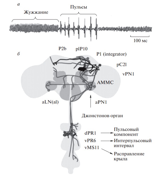 В песне D. melanogaster различают два компонента: отдельные пульсы чередуются с жужжанием (Рис. 1). Предполагается, что пульсовый компонент отвечает за видоспецифическое распознавание, а жужжание привлекает внимание самки. Показано, что, например, одни нисходящие нейроны (dPR1) определяют присутствие/отсутствие пульсовой песни; другие нейроны (vPR6) влияют на межпульсовый интервал; еще одна группа нейронов (vMS11) запускают расправление одного крыла без вибрации. Что касается мотонейронов, то известно, что разные компоненты песни активируются разными мотонейронами.