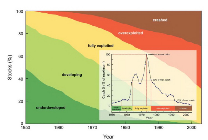 Практические приложения математической теории, тем не менее, часто связаны с потребностью построения моделей реальных биологических сообществ. Особенно остро эта проблема стоит в решении задач регулирования рыболовства. В настоящее время управление промыслом большинства видов рыб осуществляется на основе одновидовых подходов, трактующих промысловые популяции как изолированные объекты и не учитывающих трофические связи между ними. Не секрет, что число рыбных запасов, подорванных промыслом, неуклонно растет год от года (рис. 1).