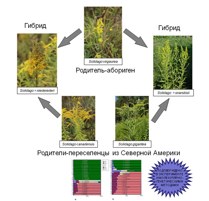 При гибридизации происходит генетическая ассимиляция, и новые гены вливаются в один или в оба родительских вида. Североамериканские золотарник канадский (Solidago canadensis) и золотарник гигантский (S. gigantea) входят в первую десятку наиболее агрессивных инвазионных видов России. Авторами статьи были найдены растения, по характеру морфологических признаков занимающие промежуточное положение между аборигенным золотарником обыкновенным (S. virgaurea) и североамериканскими вселенцами. Была выдвинута гипотеза, что они возникли в результате гибридизации, поскольку американские растения распространились достаточно широко и встретить их можно едва ли не чаще, чем золотарник обыкновенный. Кроме того, было найдено одно растение, определенное первоначально как гибрид канадского золотарника с гигантским (S. сanadensis × S. gigantea). На территории Европы уже описаны гибриды золотарников – S. × niederederi (гибрид золотарника канадского и золотарника обыкновенного) и S. × snarskisii (гибрид золотарника гигантского и золотарника обыкновенного) (см. Заглавный рисунок). Однако молекулярно-генетическими методами эти растения не были изучены. Предположительно гибридные особи были собраны в Московской области в национальном парке «Лосиный остров», в Калужской области на окраине г. Калуги, в Калининградской области, а также в Северо-Восточной Европе – в Швеции в окрестностях г. Упсала. Семена этих растений были выращены в однородных условиях на экспериментальном участке в Московской области. Из гербарных образцов предполагаемых гибридов и родительских видов была выделена ДНК, а затем для оценки гибридной природы образцов был проведен фрагментный анализ ее межмикросателлитных участков – Inter Simple Sequence Repeats (ISSR). Этот метод не учитывает те фрагменты ДНК, которые есть у всех образцов, и выделяет специфичные. Таким образом, у материнского вида мы увидим одни фрагменты ДНК, у отцовского – другие, а у гибрида мы должны обнаружить фрагменты ДНК, характерные для обоих родителей.