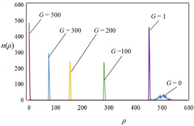Содержательно модель квазивидов описывает процесс эволюции популяции цепочек РНК. Эволюция приводит к отбору квазивида – такого распределения цепочек РНК, в которое входит как "наилучшая РНК", размножающаяся с максимальной скоростью, так и близкие к ней цепочки, отличающиеся от этой наилучшей мутационными заменами. Формально в этой модели рассматривается эволюция "особей", имеющих цепочки генотипов большой длины L. Процесс эволюционного поиска оптимального генотипа иллюстрируется рис. 1, который показывает динамику числа особей n(ρ), генотипы которых удалены на расстояние ρ от оптимального генотипа (результат компьютерного моделирования). Длина генотипа L = 1000, G – номер поколения, начальное распределение (при G = 0) генотипов случайно.
