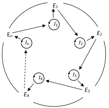 В модели гиперциклов (рис. 2) к цепочкам РНК добавляются ферменты, которые вместе с цепочками РНК формируют систему кооперативно взаимодействующих макромолекул. РНК и ферменты кооперируются следующим образом: имеются РНК-матрицы (Ii); i-я РНК кодирует i-й фермент Ei (i = 1, 2, ..., n); ферменты циклически катализируют репликацию РНК: E1 способствует репликации I2 , E2 способствует репликации I3, ..., En способствует репликации I1 . Макромолекулы кооперативно обеспечивают примитивную трансляцию. Циклическая организация гиперцикла обеспечивает его структурную стабильность.