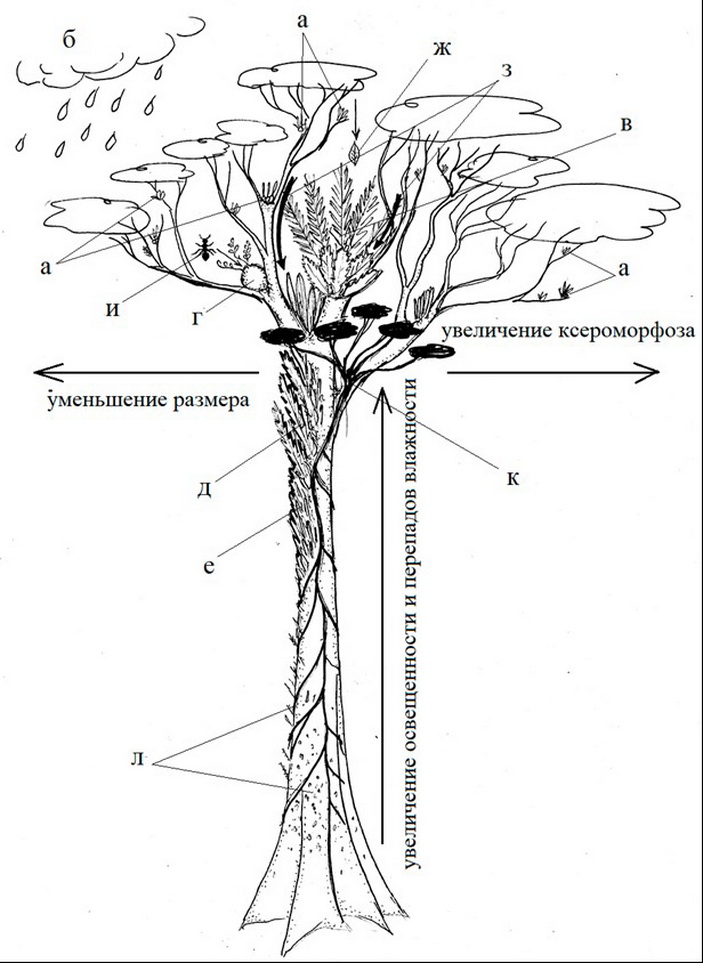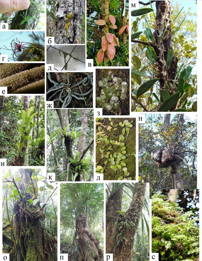 Все эпифиты для освоения эпифитных местообитаний должны были решить эти проблемы, преобразуя не только свой габитус, но и систему воспроизведения и прорастания (Рис. 2). Таким образом, структура данной работы идет вслед за этой схемой: мы рассматриваем сначала сам феномен эпифитизма (включая проблему классификации эпифитов), переходим к их экофизиологии и минеральному питанию и заканчиваем проблемой расселения в кронах, структурой эпифитных сообществ и их экосистемной ролью. На большее мы не претендовали, так как полноценный обзор современной литературы обо всех аспектах биологии эпифитов возможен только в рамках обширной монографии.